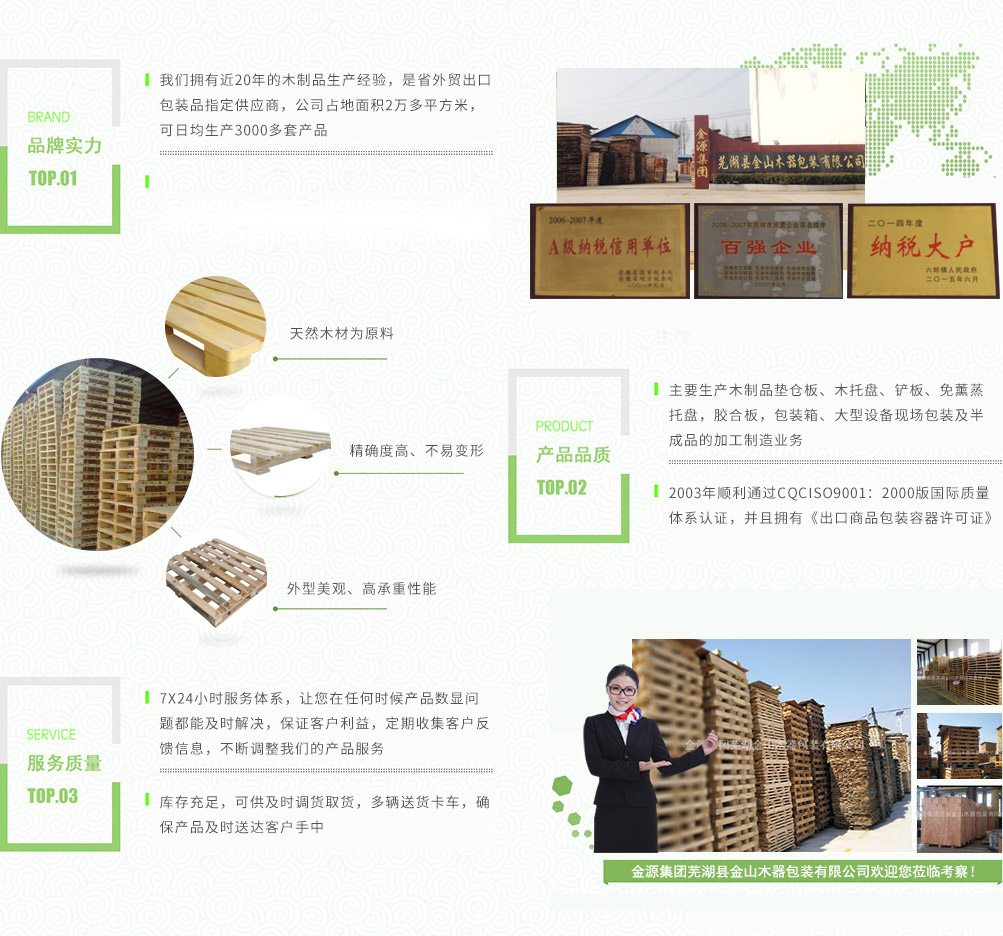 金源集團(tuán)蕪湖金山木器包裝有限公司是省外貿(mào)出口包裝品指定的供應(yīng)商,主要生產(chǎn)木制品墊倉板、木托盤、鏟板、免薰蒸托盤,膠合板,包裝箱、大型設(shè)備現(xiàn)場包裝及半成品的加工制造業(yè)務(wù)。產(chǎn)品廣泛用于物流,倉儲,港口,碼頭,機(jī)械,建材,化工,紡織,食品,超市,五金電器等行業(yè)。公司占地面積2萬多平方米,注冊資金壹佰壹拾捌萬圓整,公司擁有員工160多人,其中技術(shù)人員占25%,可日均生產(chǎn)3000多套產(chǎn)品,年產(chǎn)值6000多萬元,公司下轄木材加工廠,組裝廠,并備有大型標(biāo)準(zhǔn)烘房,多功能平板刨,壓刨,挖槽,機(jī)械設(shè)備等。產(chǎn)品主要銷往國內(nèi)大中型城市并隨貨通行出口國外。